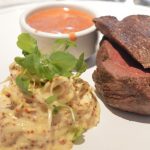 To start we had smashed avocado on rye toast with green goddess dressing and the Aster Caesar salad with Greenland prawns, smoked vendance and crispy rye. For mains, Steak tartare, green salad, sourdough toast and Fillet steak, celeriac remoulade, BBQ hollandaise – which was quite different and tasty.