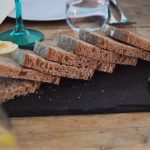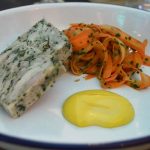 Starters – Sourdough, chicken, butter, marmite butter; salted Cornish sardines, tomatoes with quinoa; roast little gem, runner beans, tahini, cucumber; pressed rabbit, pickled carrot, and rapeseed mayo.
