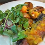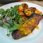 Mains – Notting Hill inspired Jerk spiced hangar, hay smoked butter, Coronation potatoes with watercress radish and pickled onions.