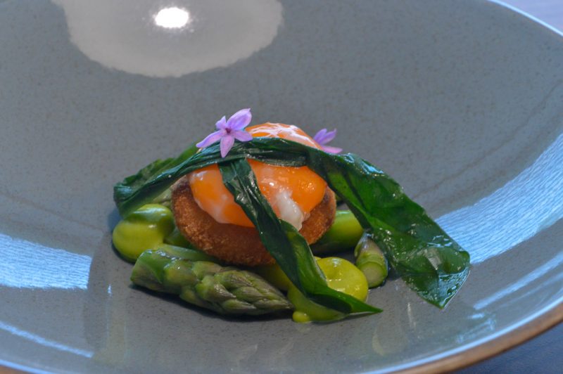 Alan Cox’s Oddington Asparagus, garlic, parsley, mayonnaise and Cacklebean egg yolk (£8)