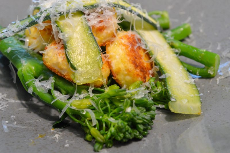 Ricotta dumplings with sprouting broccoli, courgette, peas and Regato cheese (£15)