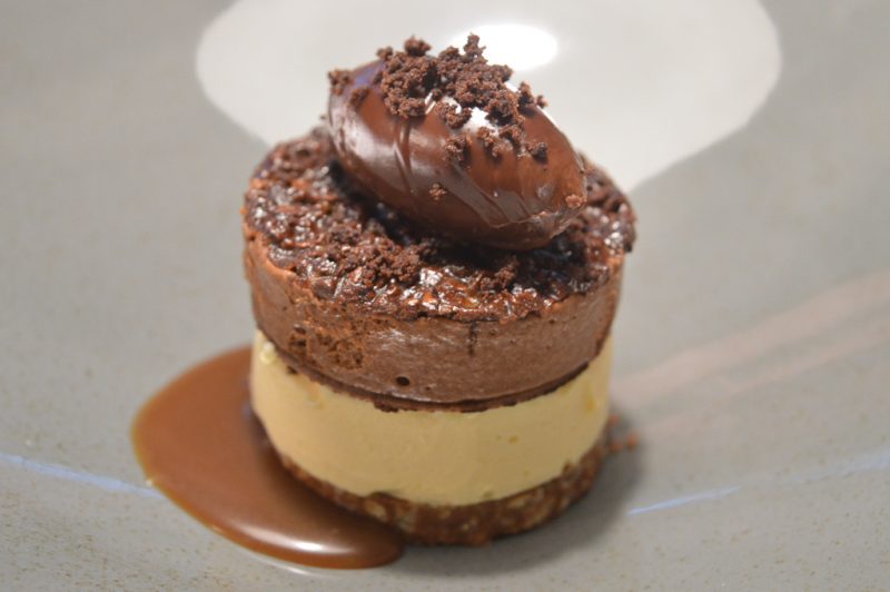 Dark chocolate mousse, white chocolate ice cream, praline rice Krispies