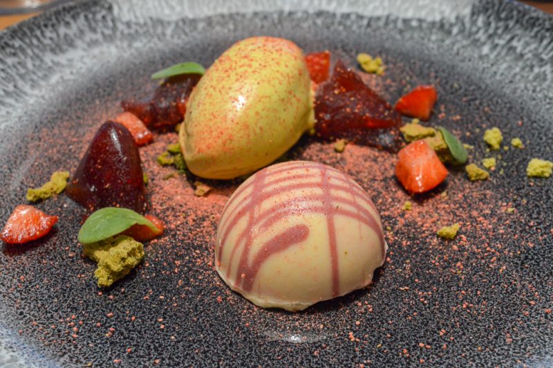 Strawberry ruby chocolate dome, pistachio ice cream (£7)