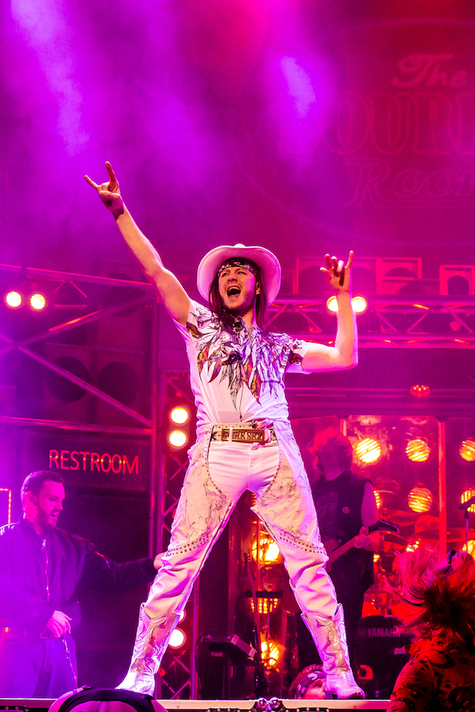 My favourite character was Lonny, played by Lucas Rush, who acts as narrator, clown and fool. To use a technical term, the character of Lonny, ‘breaks down the fourth wall’ to address the audience directly and to let them in on the joke – whether that’s Drew friend-zoning himself with Sherrie or how Stacee Jaxx ends up in Nicaragua.